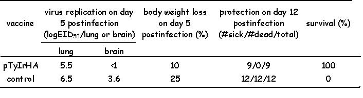 Results Table 2. Protection against lethal H5N1 virus challenge induced from DNA encoding HA from TyIr83