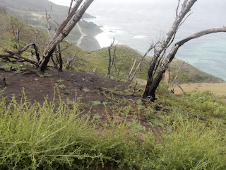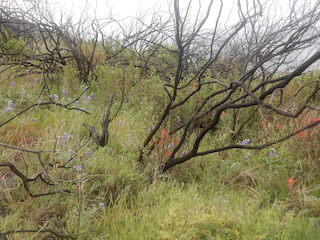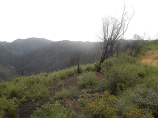 The Landels-Hill Big Creek UC Reserve is a dynamic place. On this day, last week, I was interested to observe the devastating impact and recovery underway of a very hot fire that swept through most of the reserve in August 2020, about 20 months ago, affecting most of the trees and vegetation but fortunately sparing the lower Big Creek canyon and its buildings, as well as Whale Point thanks to prudent fire breaks and implemented emergency sprinklers. Hiking up Highland Trail, it was a stark view of the removal of most trees in higher biomes, but now about 20 months later with abundant growth of the plants normally found in the open, but also with many trees sprouting every which way from their charred bases. A major rain event in January 2021, about 14+ months back, caused major changes to the creek with dramatic erosion of hillsides, and huge logs swept toward the ocean, taking out most of the trees near Big Creek's mouth, previously spared in the fire, and creating the first sandy beach at the ocean junction in recent memory. My overall impression was that the cycle of forest succession has begun again but full recovery would depend on the previously normal climate of heavy fog along with winter rain, but the Central Coast has instead experienced an extremely dry first part of 2022 following some December storms. Still, I was very happy to experience lush growth of the low vegetation and some signs of the return of animals, hopeful for the future.Return to Biology 317 Fieldtrip Map or Bio 317 Field Marine Biology Home Page